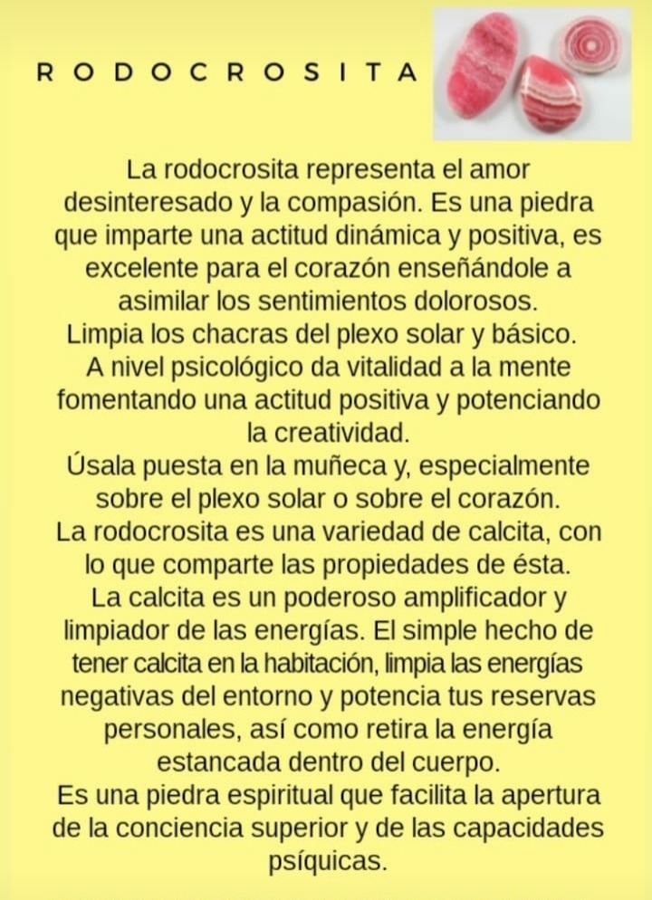 La rodocrosita representa el amor desinteresado y la compasión. Es una piedra que imparte una actitud dinámica y positiva, es excelente para el corazón enseñándole a asimilar los sentimientos dolorosos.