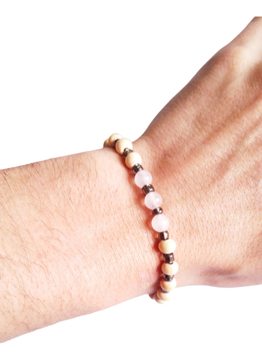 Cuarzo Rosa, PULSERA De Cristales y Cuentas de Madera